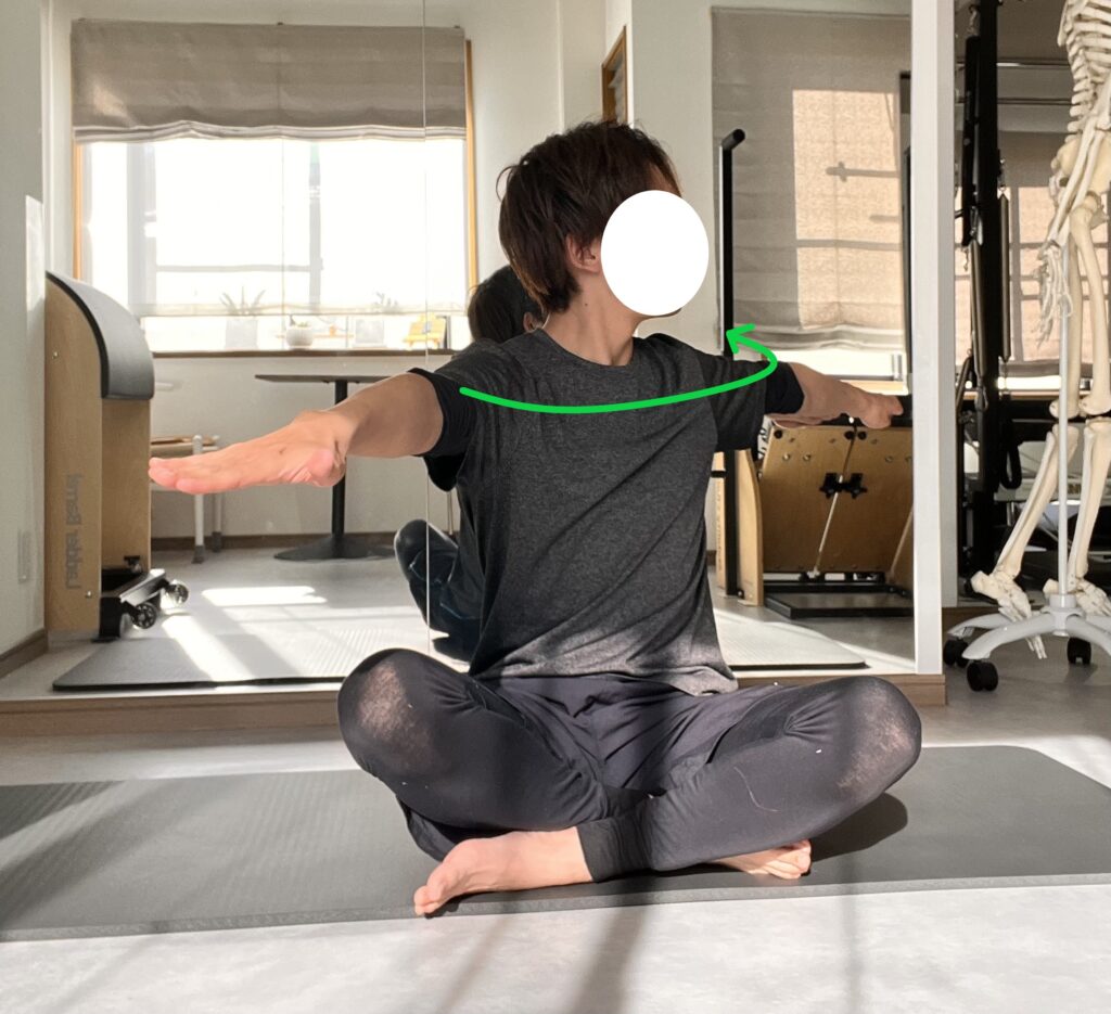 回旋時は胸郭の捻じれを意識し、できるだけ臀部は左右とも地面に均等に常に乗せておくイメージで行います。胸椎の回旋可動域が広がると、肩・首の負担を軽減することができます。
