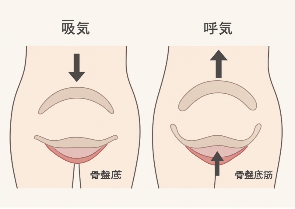 呼吸の活用:息を吸う時に横隔膜が下がり、吐く時に骨盤底筋が引き上がる動きを促す。