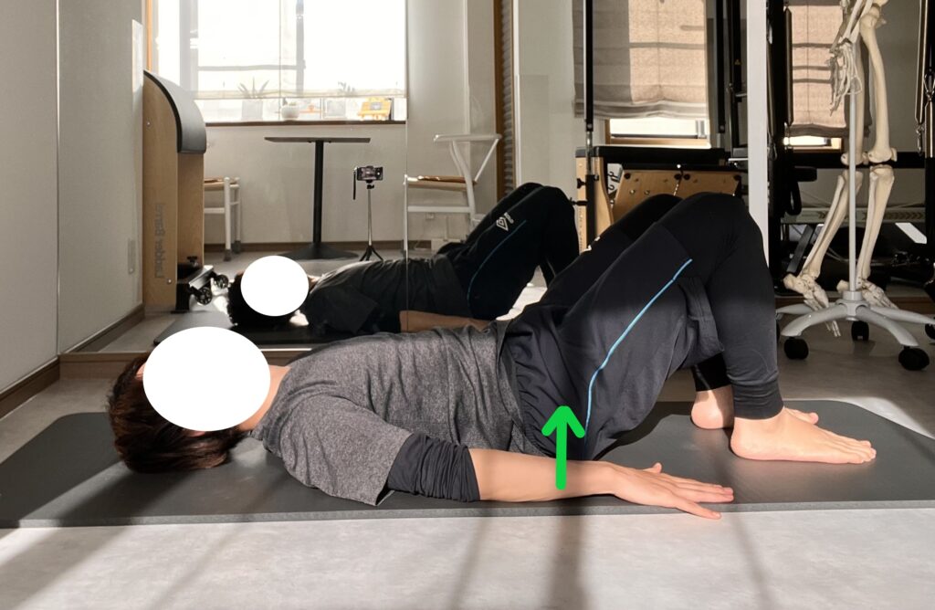 仰向けで膝を立て、吐きながら骨盤を丸めて背骨を一つずつ床から離し、肩から膝まで一直線に。吸ってキープします。