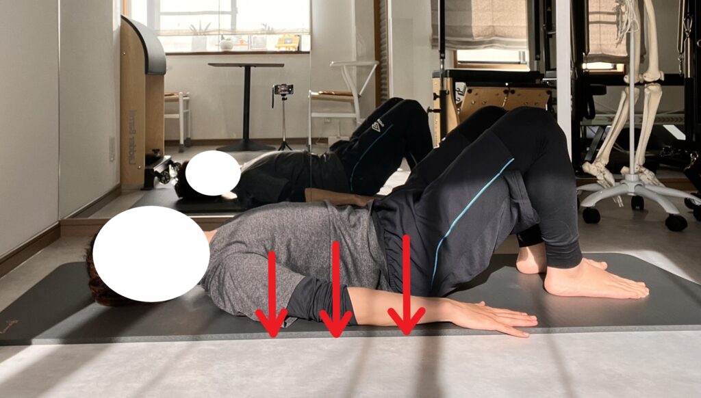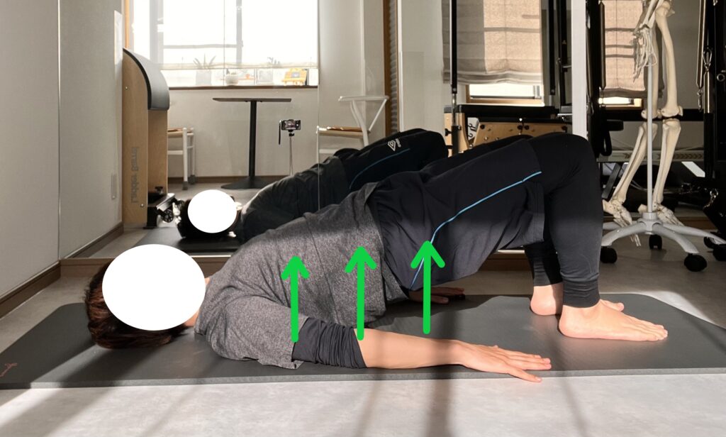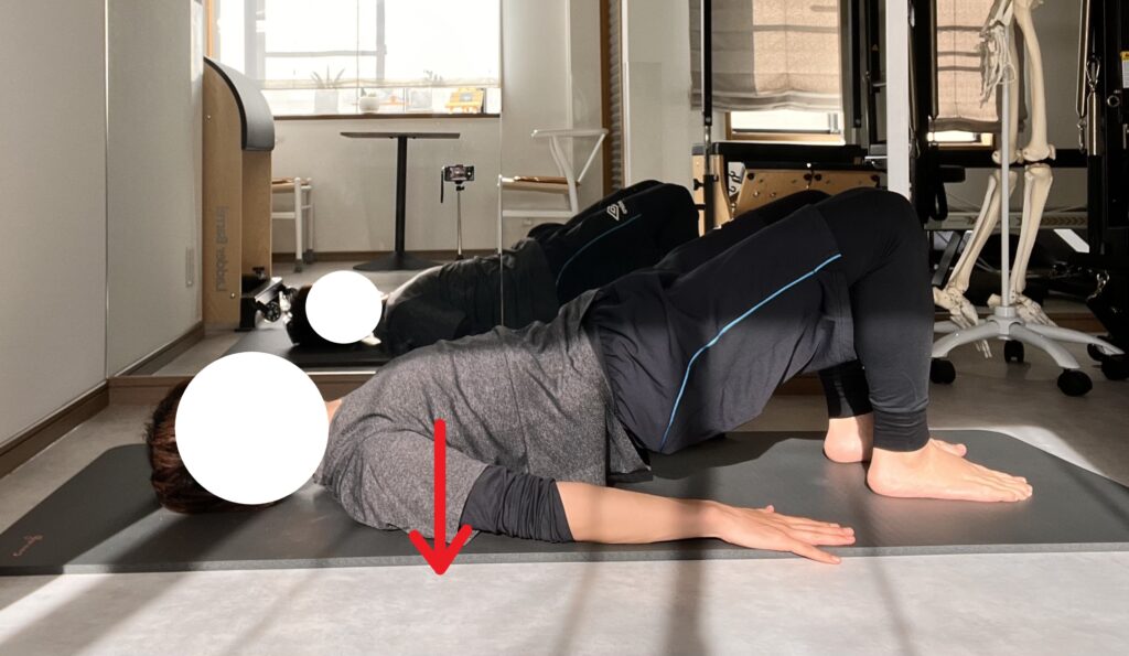 次に吐きながら背骨の上側から一つずつ背骨を下ろすように戻ります。10回。