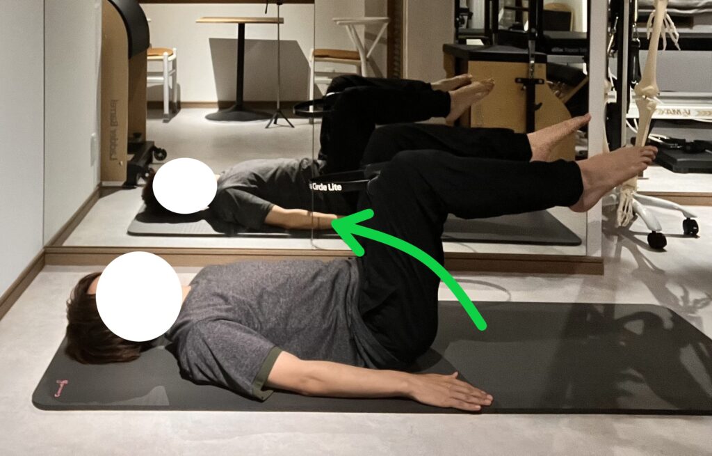 次に腹圧が入った状態で足を持ち上げるレッグリフトの練習を行います。