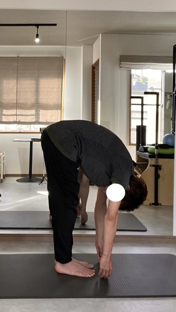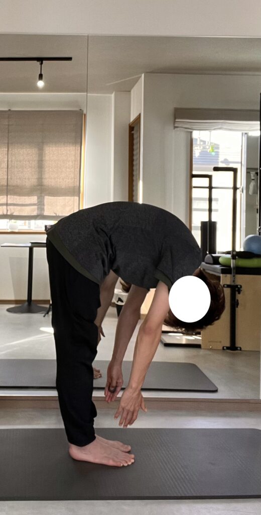 まず立位になります。その状態からゆっくりと頭部から尾側に向かって背骨を一つずつ動かしながら前屈をしていきます。そして前屈した後は尾側から頭部にかけて一つずつ背骨を起こしながら立位の状態に戻っていきます。