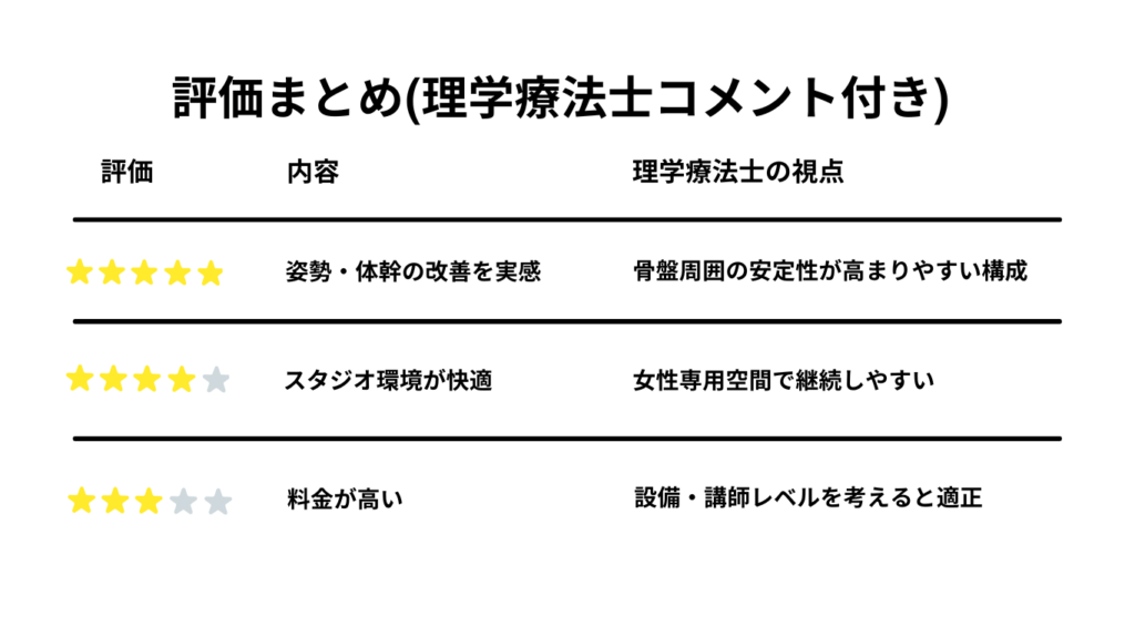 理学療法士としての視点から見ると、ピラティスKは「運動療法と姿勢改善」をバランス良く取り入れたスタジオといえます。